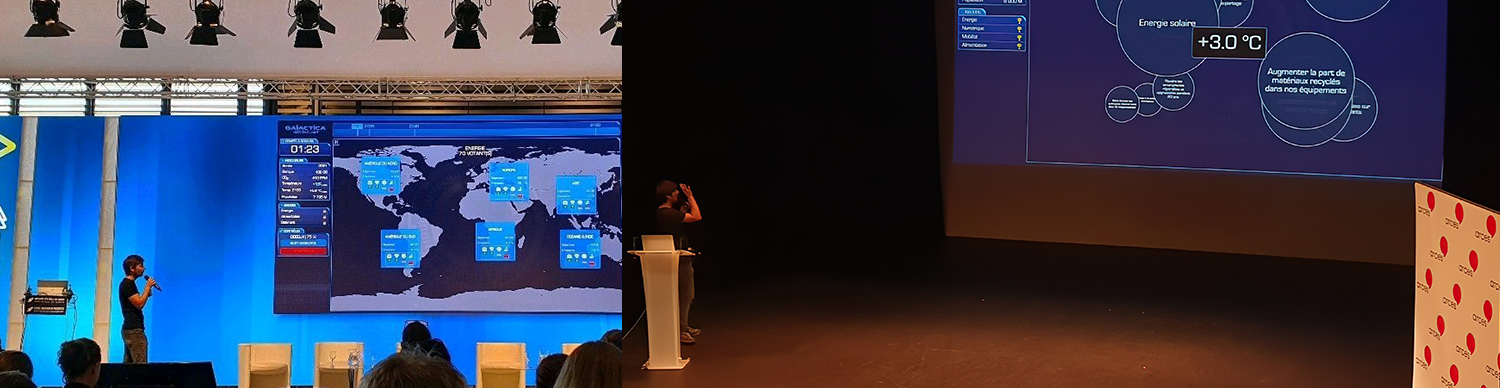 Après une phase introductive et un rapide tutoriel, les participants dégainent leurs smartphones ou des cartons de vote pour agir en temps réel et tenter d’infléchir le cours du réchauffement climatique.